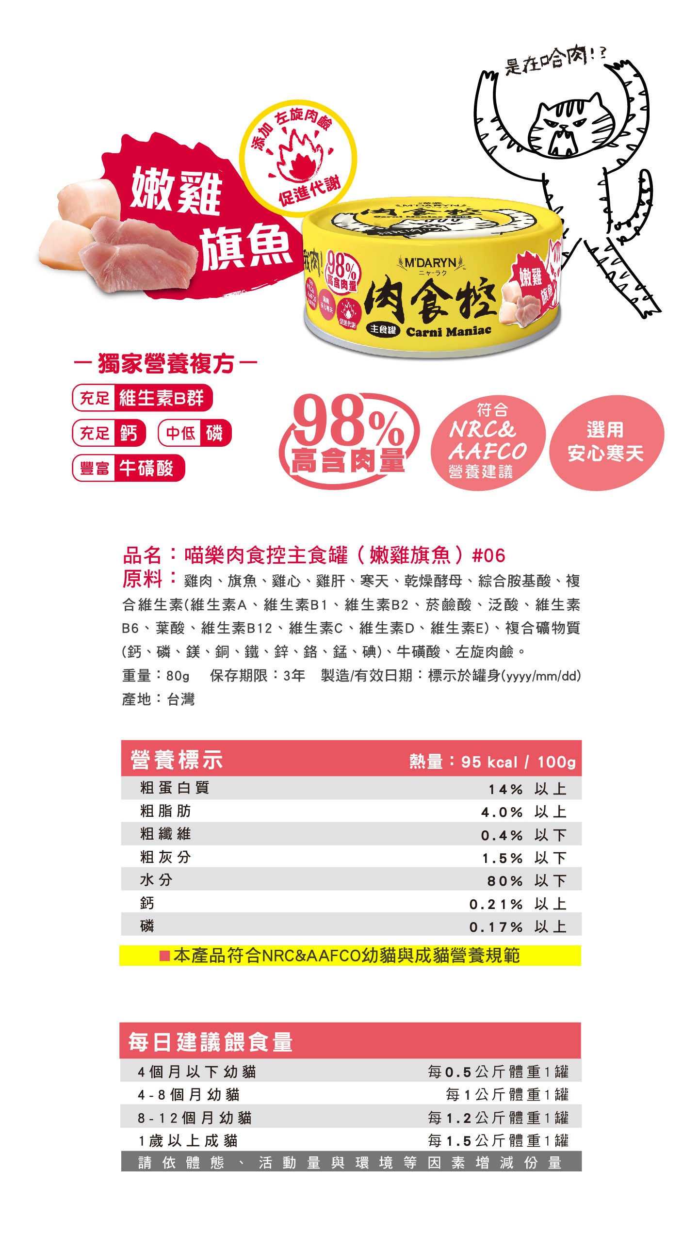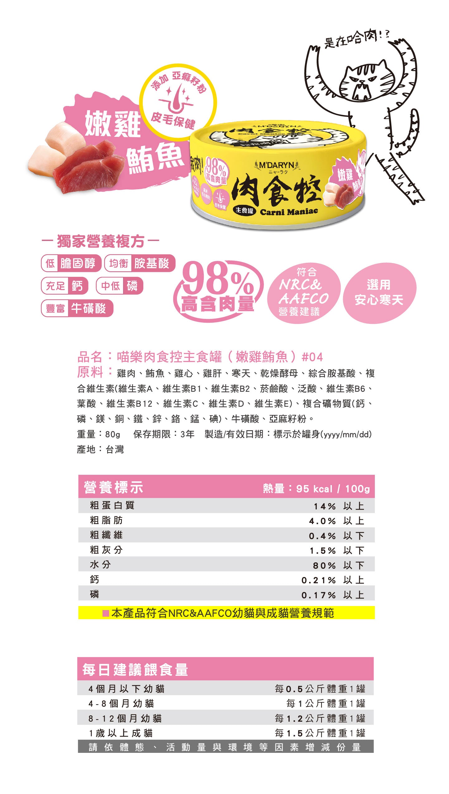 雞肉、鮪魚、雞心、雞肝、寒天、乾燥酵母、綜合胺基酸、複 合維生素(維生素A、維生素B1、維生素B2、菸鹼酸、泛酸、維生素B6、 葉酸、維生素B12、維生素C、維生素D、維生素E)、複合礦物質(鈣、 磷、鎂、銅、鐵、鋅、鉻、錳、碘)、牛磺酸、亞麻籽粉