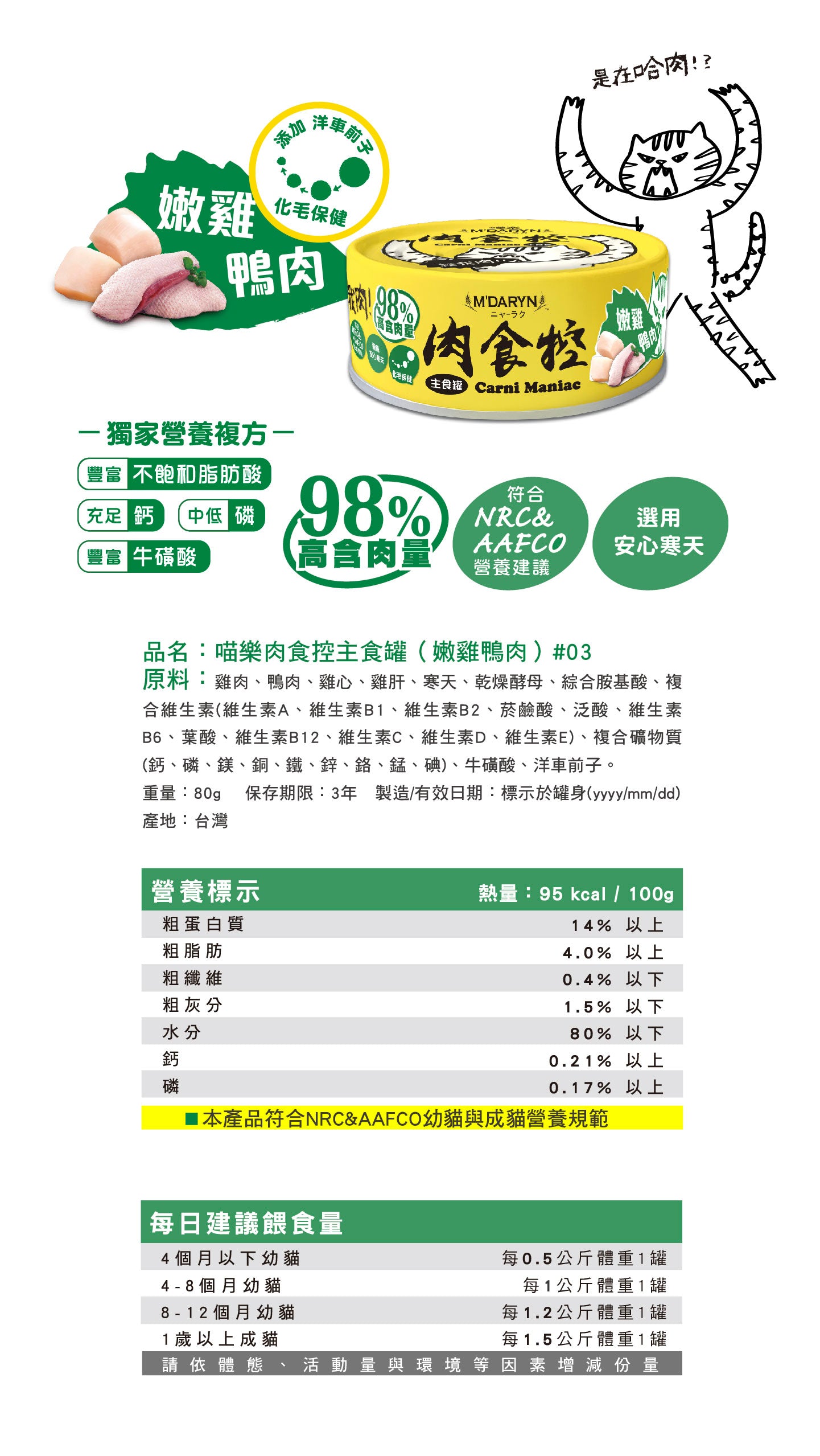 雞肉、鴨肉、雞心、雞肝、寒天、乾燥酵母、綜合胺基酸、複 合維生素(維生素A、維生素B1、維生素B2、菸鹼酸、泛酸、維生素 B6、葉酸、維生素B12、維生素C、維生素D、維生素E)、複合礦物質 (鈣、磷、鎂、銅、鐵、鋅、鉻、錳、碘)、牛磺酸、洋車前子