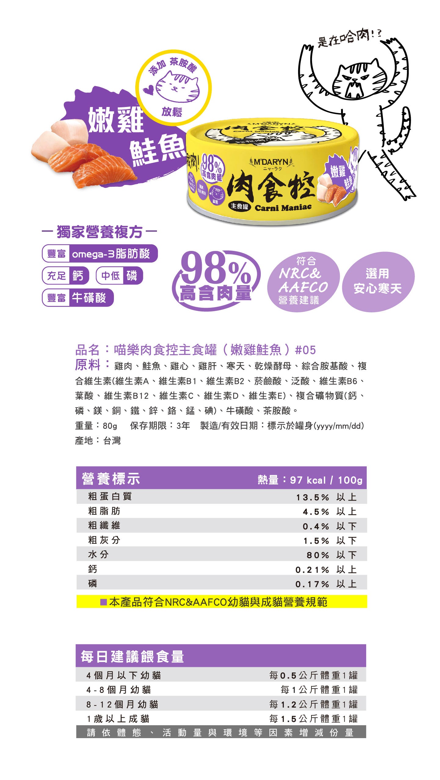 雞肉、鮭魚、雞心、雞肝、寒天、乾燥酵母、綜合胺基酸、複 合維生素(維生素A、維生素B1、維生素B2、菸鹼酸、泛酸、維生素B6、 葉酸、維生素B12、維生素C、維生素D、維生素E)、複合礦物質(鈣、 磷、鎂、銅、鐵、鋅、鉻、錳、碘)、牛磺酸、茶胺酸