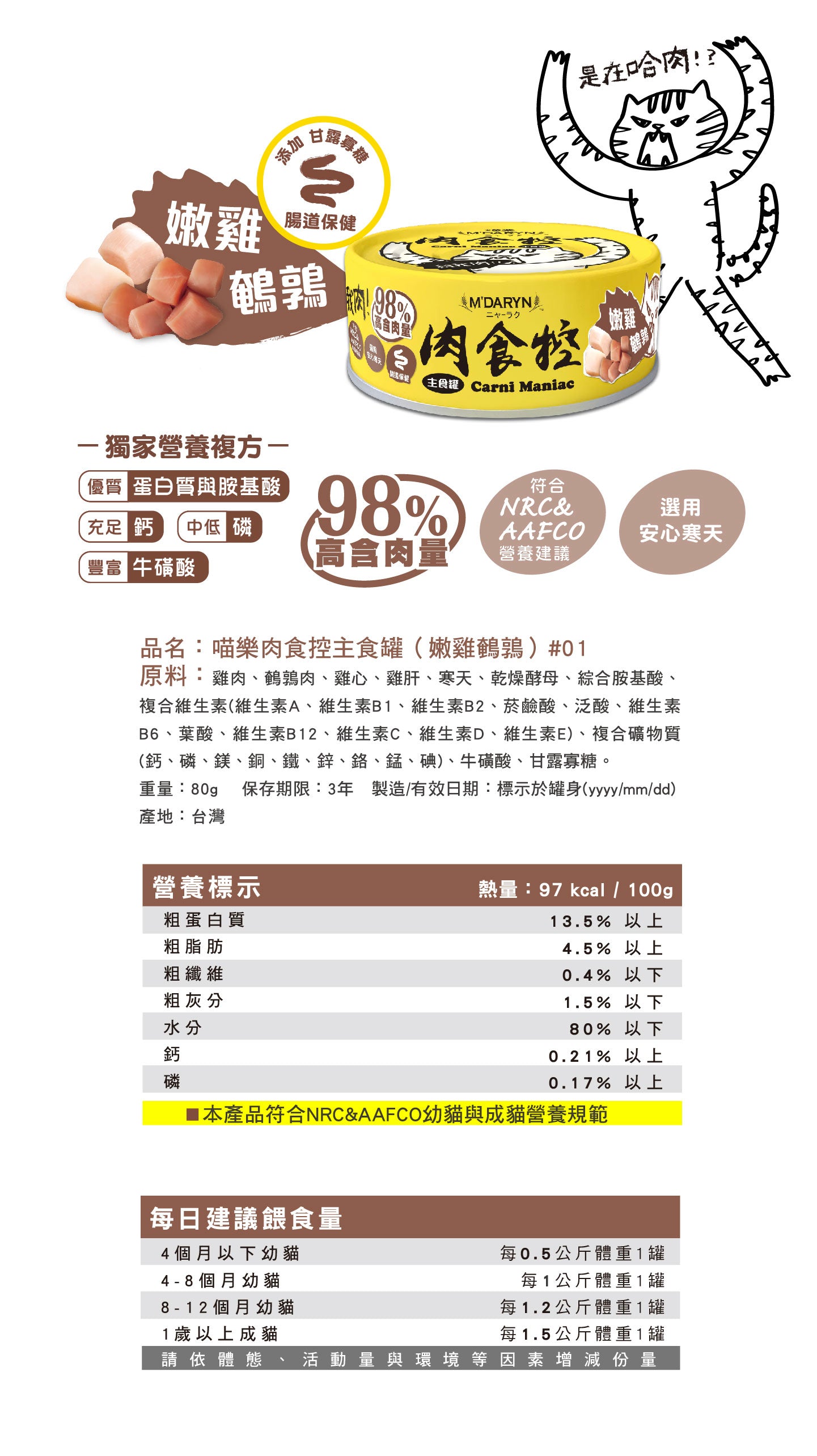 雞肉、鵪鶉肉、雞心、雞肝、寒天、乾燥酵母、綜合胺基酸、 複合維生素(維生素A、維生素B1、維生素B2、菸鹼酸、泛酸、維生素 B6、葉酸、維生素B12、維生素C、維生素D、維生素E)、複合礦物質 (鈣、磷、鎂、銅、鐵、鋅、鉻、錳、碘)、牛磺酸、甘露寡糖