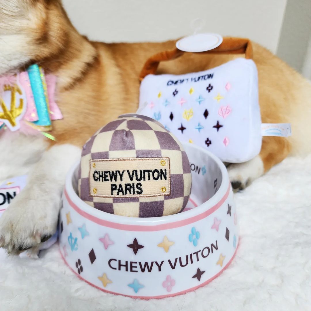 Chewy Vuiton Checker Bone 玩具 - 看著主人每日精緻高雅的裝扮,小狗們也想加入主人的行列,戴上致敬款Chewy Vuiton 骨頭來時尚的玩耍。商品由柔軟的毛絨製成,內部有一個吱吱聲的發聲器。設計風格時尚獨特,讓愛犬也走在潮流前端。
