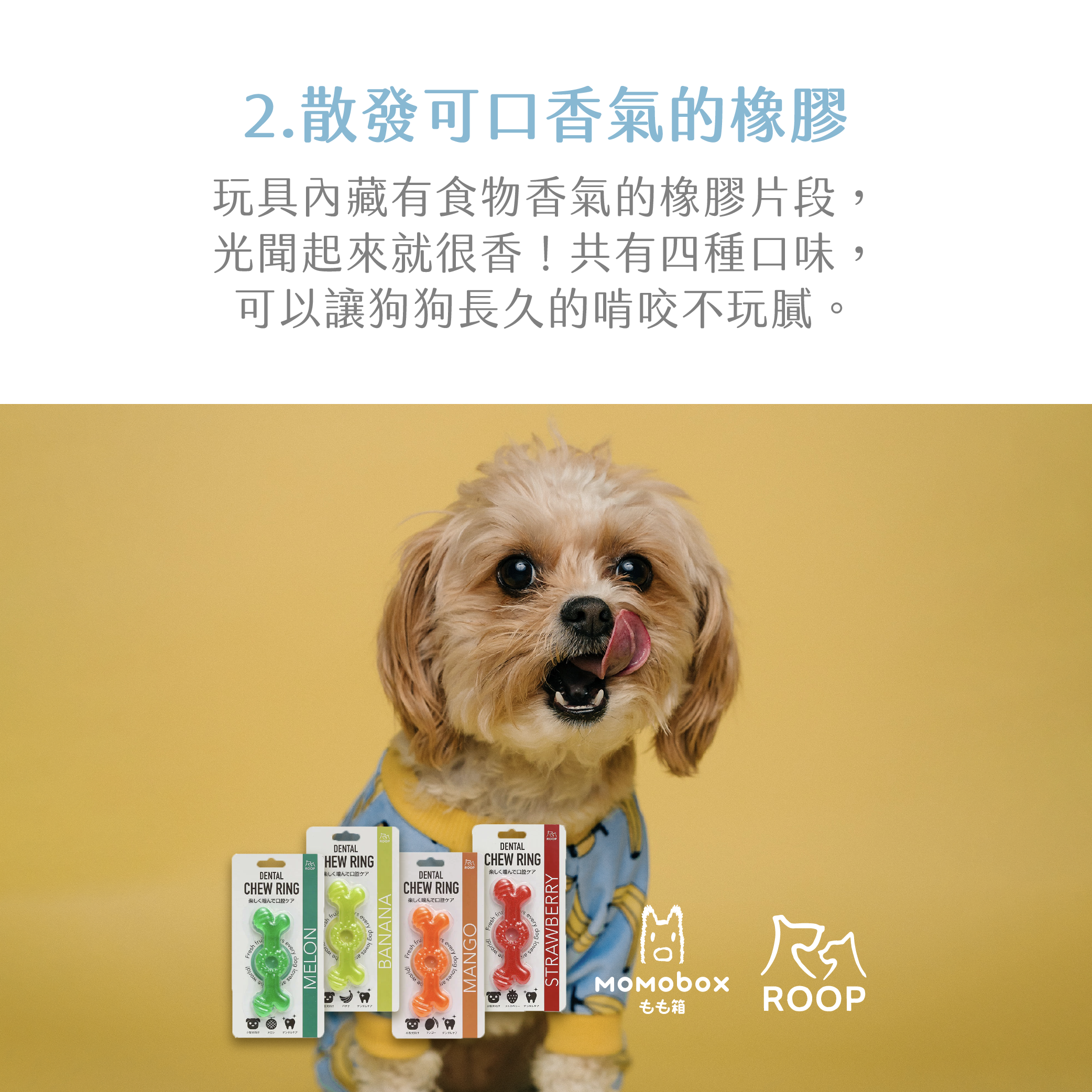 “日本ROOP 水果口味潔牙玩具”以軟膠材質設計,特別適合給幼犬或咀嚼力較弱的小型犬與牙齒較弱的熟齡犬使用。可口的水果香味可讓愛犬盡情咀嚼,排解無聊感。